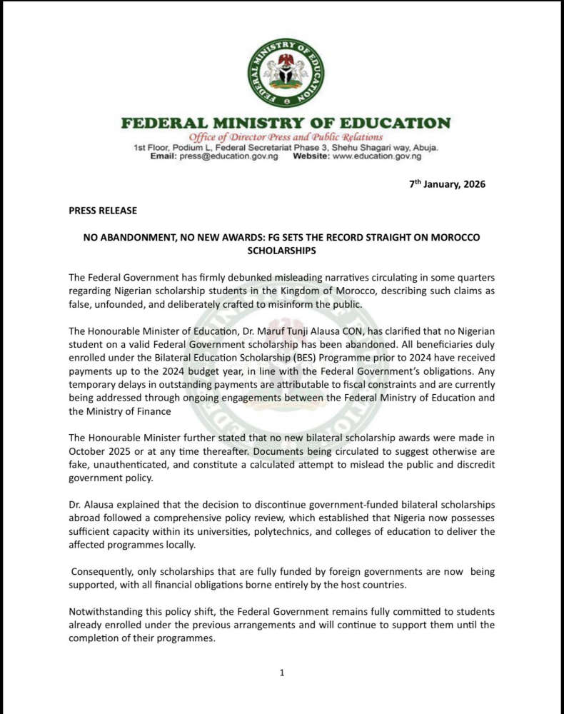 The Federal Ministry of Education has formally dismissed reports alleging that Nigerian scholarship students in the Kingdom of Morocco have been abandoned.