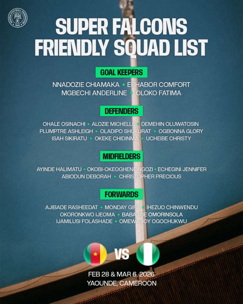 Super Falcons head coach Justine Madugu has named a 25-player squad for Nigeria’s upcoming international friendly matches against Cameroon as preparations continue for the 2026 Women’s Africa Cup of Nations (WAFCON).